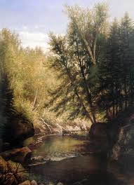 Laura Woodward, Adirondeck Woodland with Deer, has an infinite variety of greens, from very light to dark. The two deer are barely shown against the daylight around the bend of a stream and under the tall trees on the right.