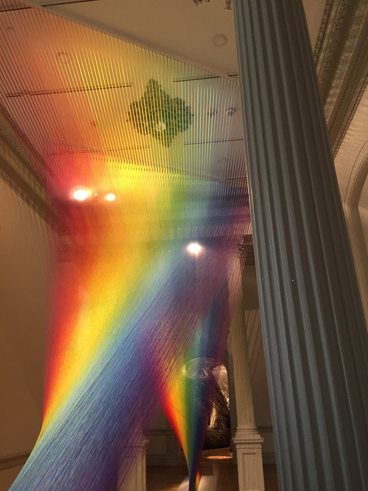 Then a rainbow of colors invited me into the next room. Plexus 1A is miles of strings that weave prisms of color into the monumental architecture. Gabriel Dawe is the artist. His design recalls the colors and embroideries of his early life in Mexico City and current home in East Texas. Viewers are invited to take their own photographs. It’s appropriate that the Renwick is a building dedicated to the contemporary crafts, since each of these works of art focuses on the materials and the tremendous time, skill and dedication required for fine art crafts.